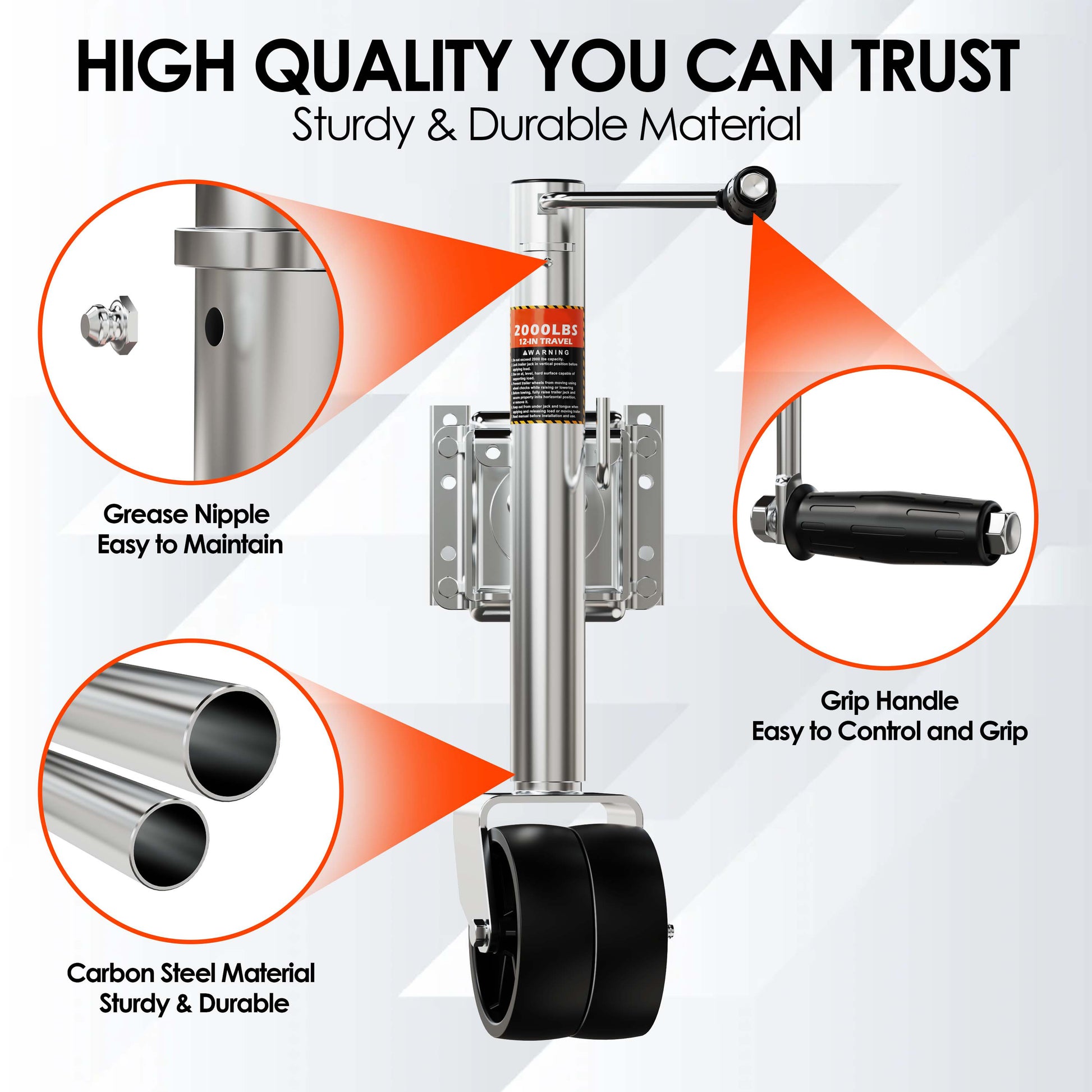 - Robust Lifting Capacity: Elevate your trailering experience with our trailer jack, boasting a robust lifting capacity of 2000 lbs; effortlessly adjust heights from 25.5 to 37.8 inches to accommodate trailer tongues ranging from 3" to 5"