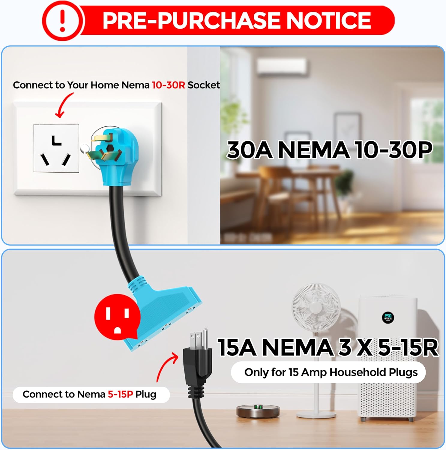 - ELECTRICAL RATING: NEMA 10-30P male for dryer, 3X NEMA 5-15R household connectors for household electrical appliances and tools, 10 gauge 12 inch